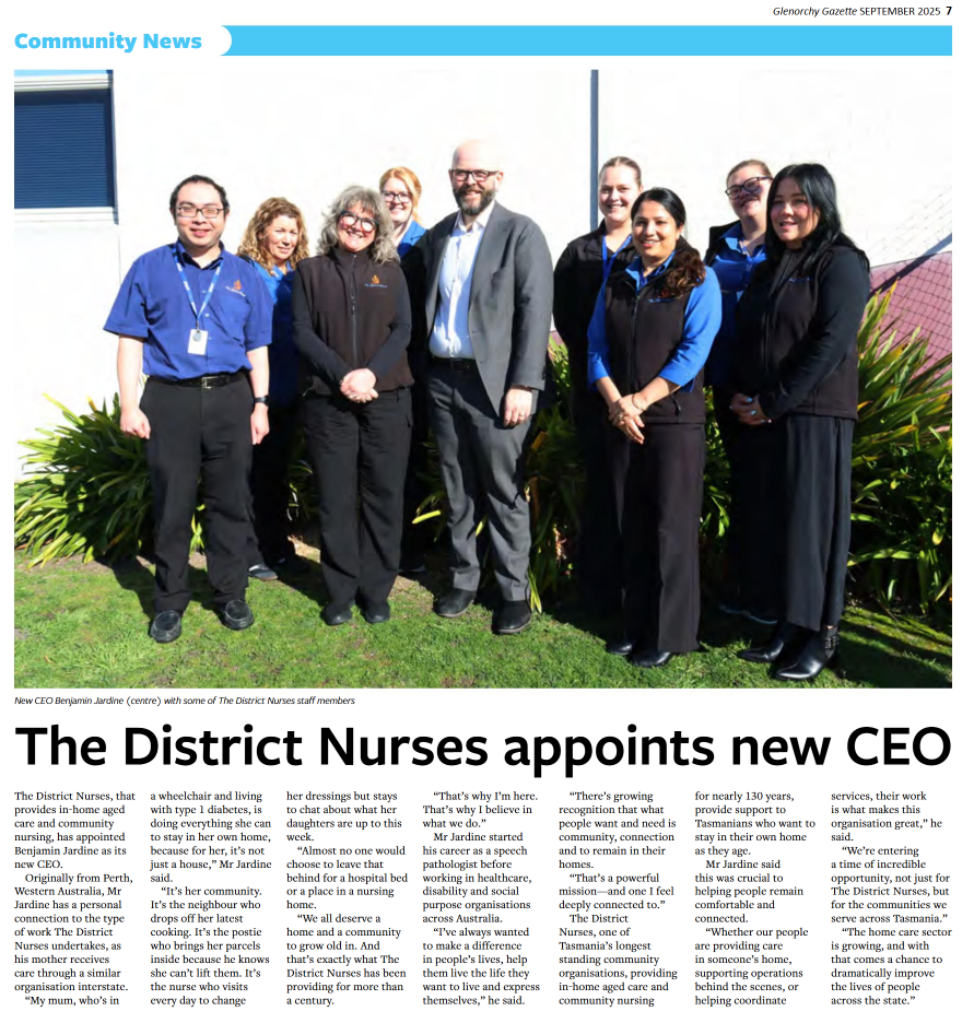 This news about our new CEO, Benjamin Jardine, recently featured in the Glenorchy Gazette. We’re delighted to share the story and highlight Benjamin’s vision for the future of The District Nurses.